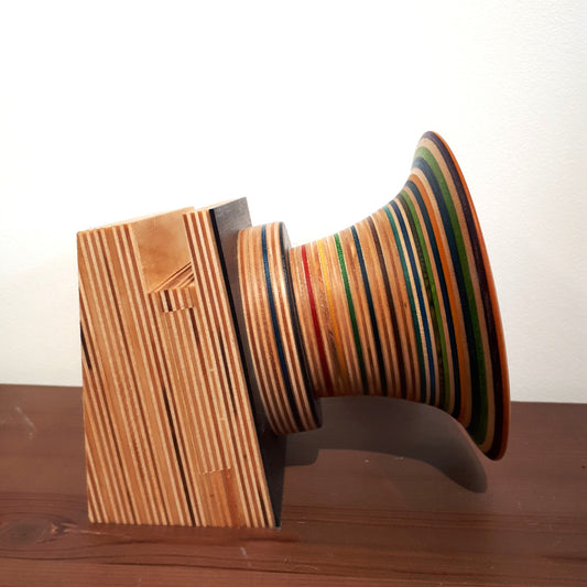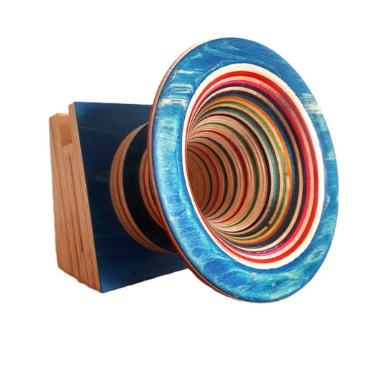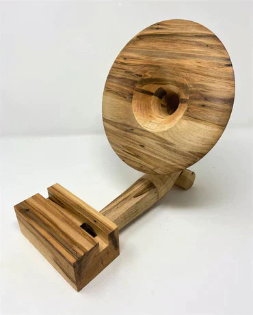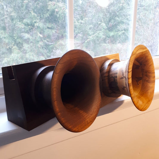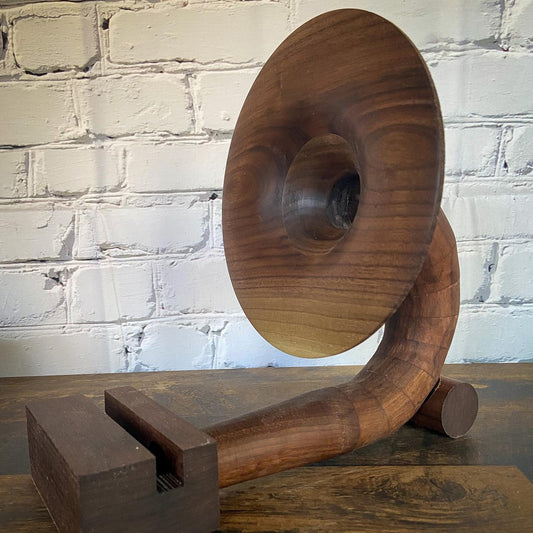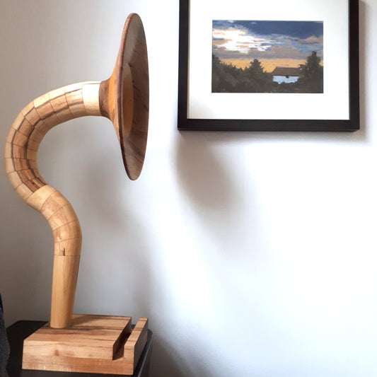 Neill Nucifora, currently living in Shelburne, Ontario, had a life-long obsession with gramophones, and Sherlock Holmes. He noticed that the ones he found had two setbacks; a manual crank or they were limited to only playing records. So he thought, “how do I get that cool vintage sound but use it with modern technology?” And that's when it hit him...build it! Drawing on a decade of woodworking experience ranging from custom furniture to custom drum sets, he set out to try and replicate that traditional “sound”. After months of trial and error and countless prototypes, he created a way to utilize different horn and tube combinations, and different varieties of wood to create a truly one-of-a-kind listening experience. Most are available to see and HEAR in person at Unperfekt Studios in the Hamilton Farmers Market.