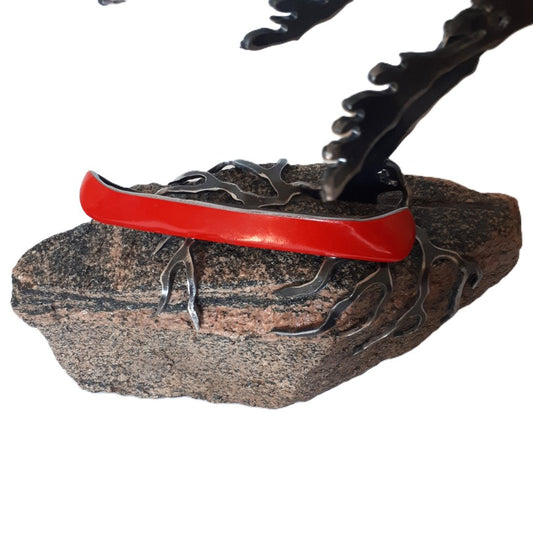 Steel Tree Sculpture with Red Canoe on Canadian Rock 325
