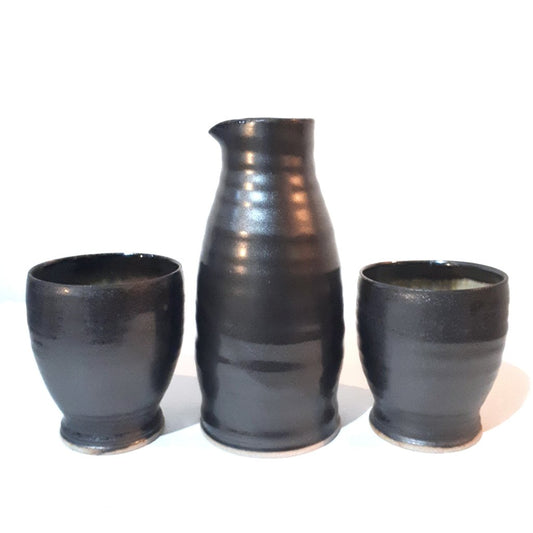 Pottery Wine Carafe & Cups Set - Black Glaze